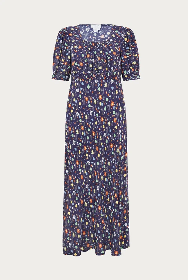 A fun and floral print on a navy background, Becca is midi in length and crafted from our heavier winter crepe. Fitted under the bust, with ruched detail gives the dress its fit and flare style, as do the short puffed sleeves with elasticated cuffs.
