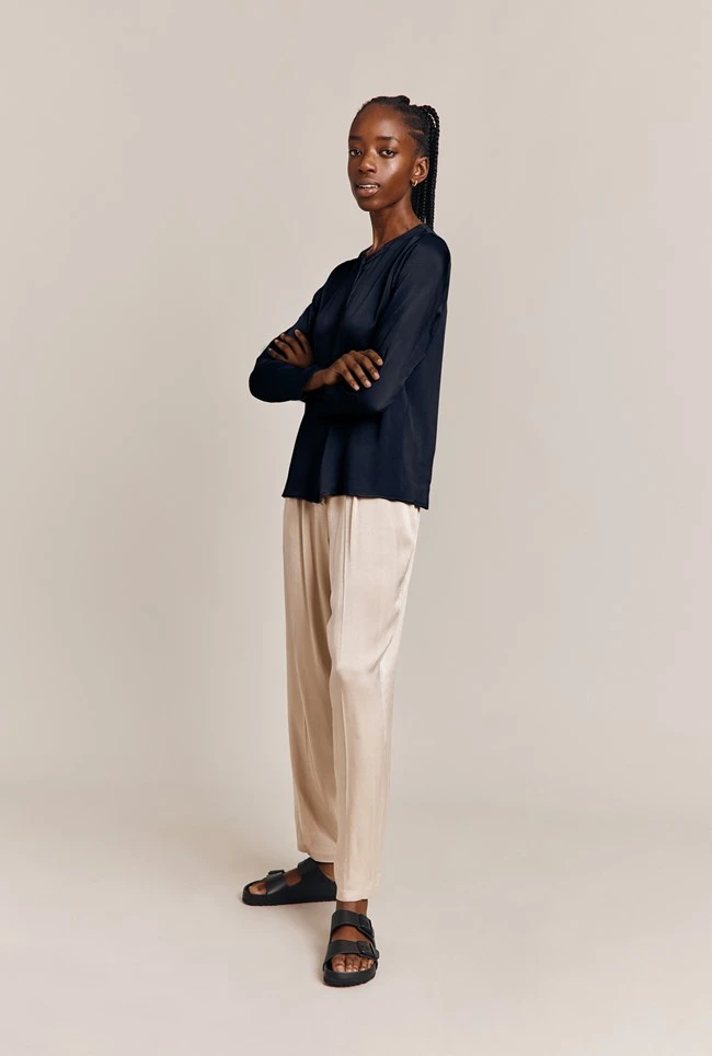 Say hello to your new go-to blouse â Efie. In a range of beautiful colours and crafted from our signature satin, Efie features simple straight sleeves, a round neckline to frame the face and front button detail. Pair with out Ella Trousers for the complete look.