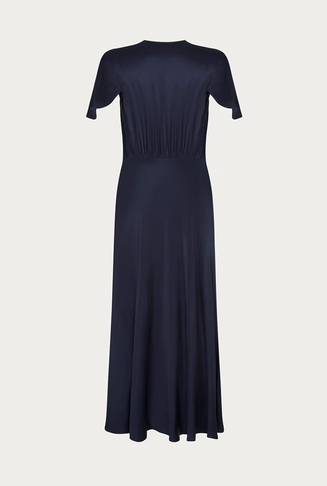 Based on our much-loved Delphine dress, Grace shares all of the same style signatures but has been reworked in a midi length. Inspired by vintage designs, it features a gentle V-neck and button-through front that gives way to an elegant centre split. With delicate angel sleeves and subtle gathered detailing around the shoulders and bust, itâs cut on the bias with an empire line for a flattering fit. Made from heavy satin fabric obtained from sustainable sources, Grace in navy is an occasion wear must-have that makes a perfect bridesmaid dress.