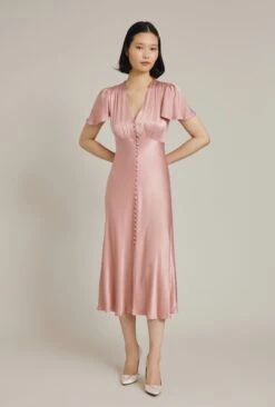 Based on our much-loved Delphine dress, Grace shares all of the same style signatures but has been reworked in a midi length. Inspired by vintage designs, it features a gentle V-neck and button-through front that gives way to an elegant centre split. With delicate angel sleeves and subtle gathered detailing around the shoulders and bust, itâs cut on the bias with an empire line for a flattering fit. Made from heavy satin fabric obtained from sustainable sources, Grace in rose is an occasion wear must-have that makes a perfect bridesmaid dress.