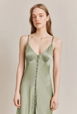 A button-through slip dress with a flattering empire line bust, Jada is crafted from our luxurious heavy satin. With adjustable straps she can be altered to ensure the perfect fit. Midi in length Jada is a summer wardrobe staple you can dress up or down to a number of occasions.