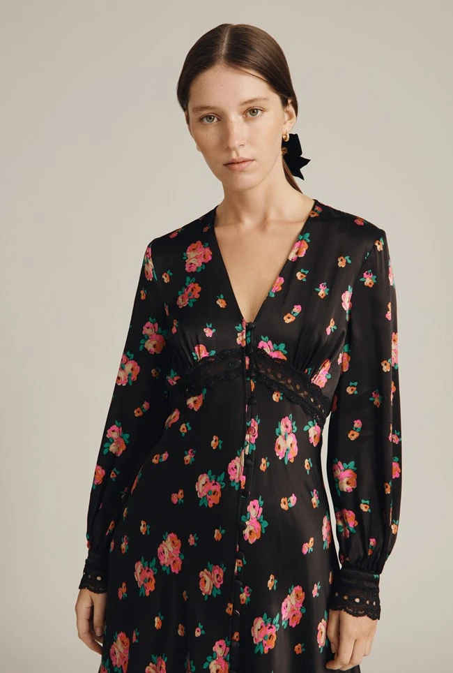 Dressed up or down – Sara is one of those dresses you will reach for season after season. Made from filament satin and buttoned through for a flattering fit, this vintage rosebud midi dress features long blouson sleeves with small cuff detailing. Plus, the lace inserts that adorn the sleeves and waist add a sensual on-trend twist. Dress up with boots or heels and for a relaxed look wear with a pair of sneakers and a biker jacket.